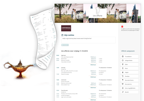 Magic is het enige cloud-based systeem waarbij u binnen enkele minuten een uiterst persoonlijke én gedetailleerde offerte maakt voor een bruiloft, verjaardag, bedrijfsfeest en elk ander feest.